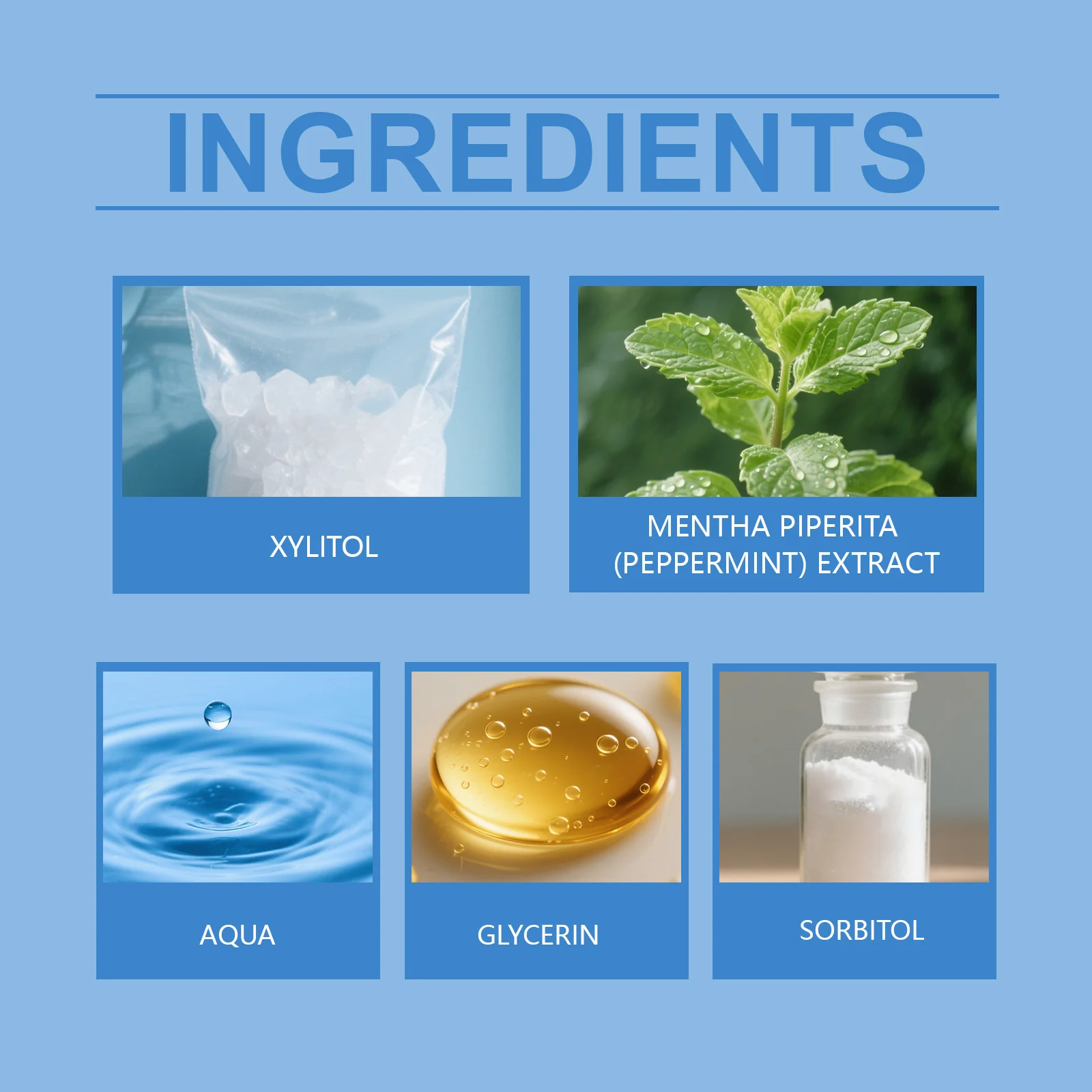 INGREDIENTS:AQUA、GLYCERIN、SORBITOL、XYLITOL、MENTHA PIPERITA (PEPPERMINT) EXTRACT